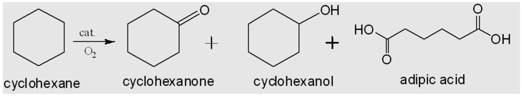 Manufacture of adipic acid through the oxidation of cyclohexane.