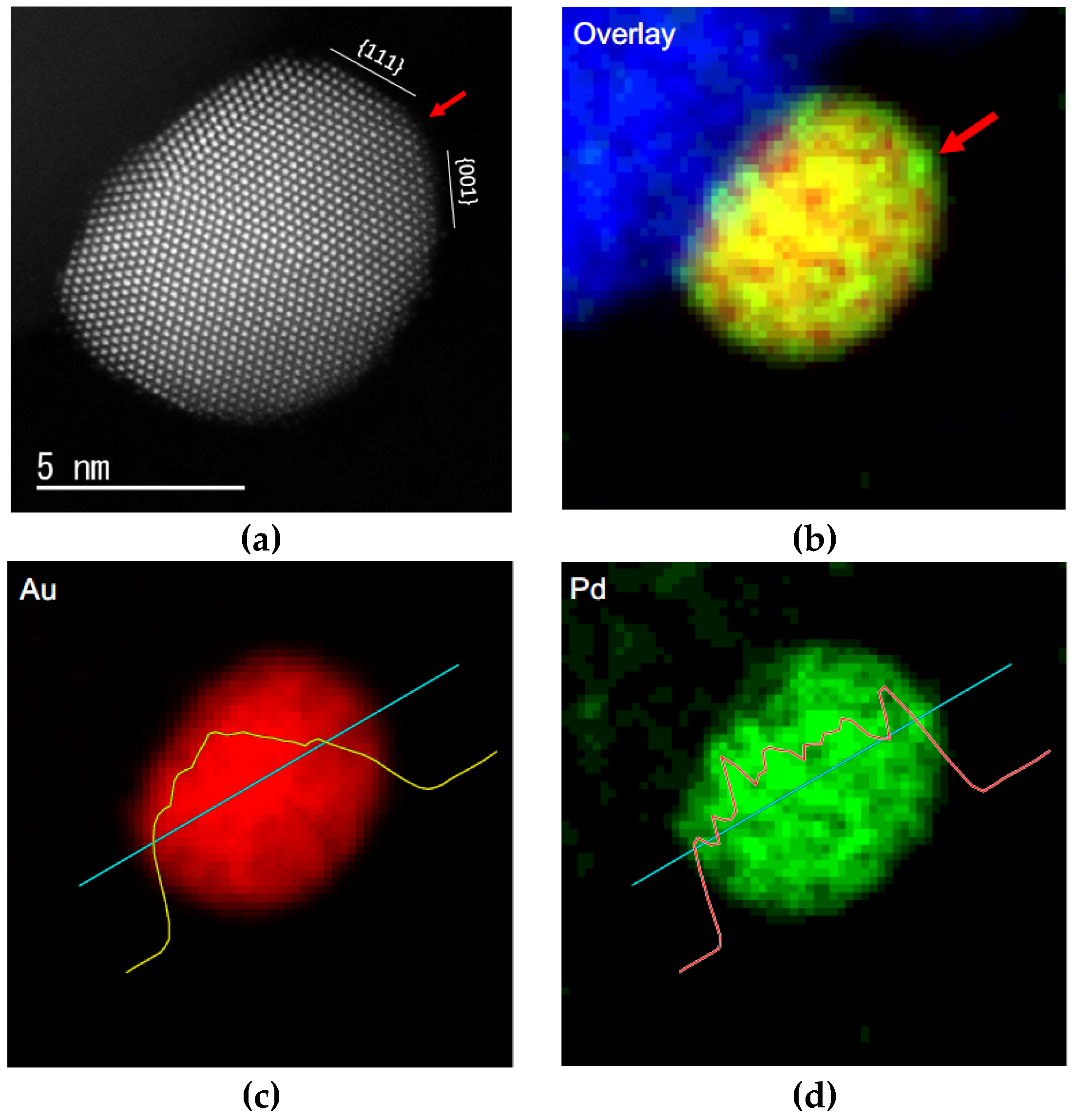 HRTEM image (a) of a single Au core-Pd shell nanoparticle dispersed on graphene. STEM-HADDF image (b) of the hybrids. EELS (electron energy loss spectroscopy) spectrum images (c,d) of a single nanoparticle—Adapted with permission from [77]. Copyright 2011, Royal Society of Chemistry.