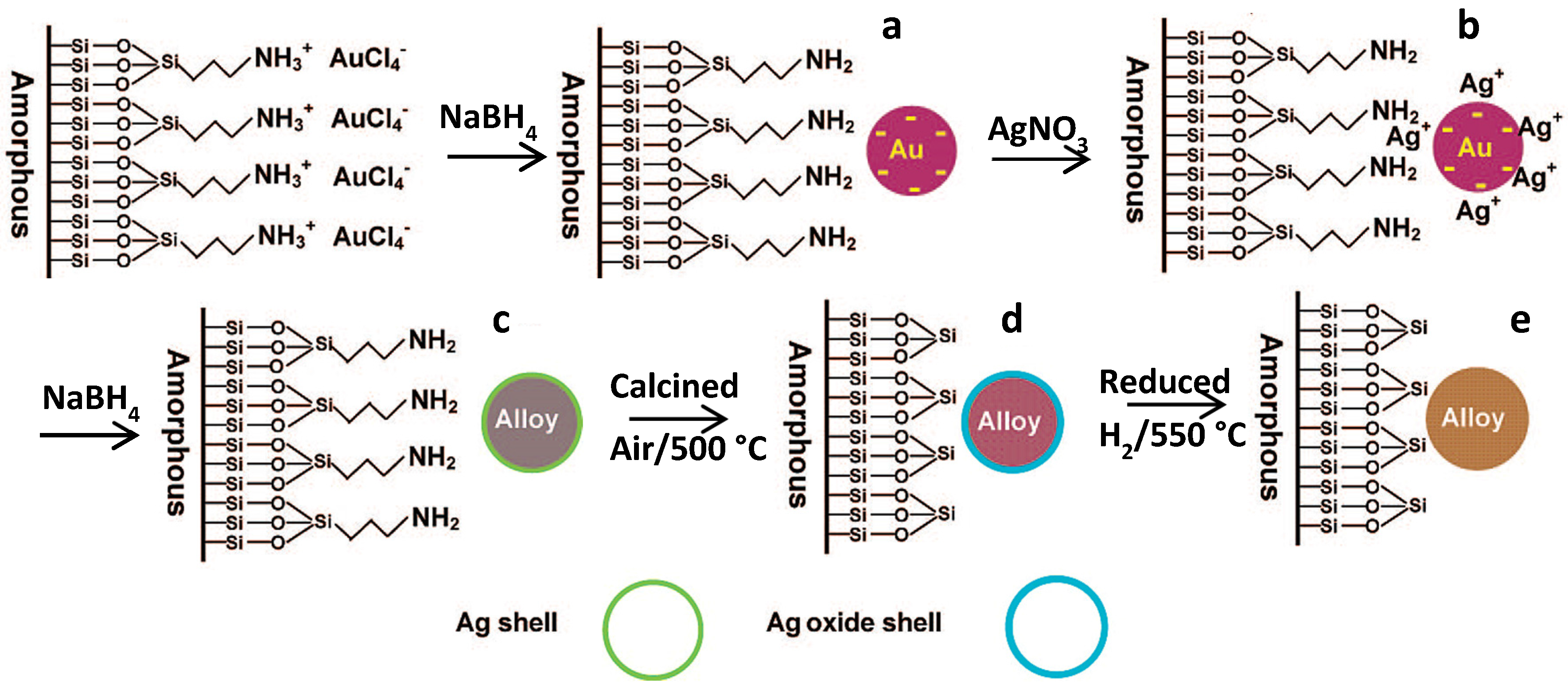 Schematic illustration of the procedure of synthesis of SiO2-supported Au-Ag alloy nanoparticles. (a) Initially formed Au particles; (b) AgNO3 adsorbed on the Au particles; (c) Au-Ag nanostructure with alloy core surrounded by a silver shell; (d) Au-Ag nanostructure with more gold-rich alloy core covered by a Ag oxide shell; (e) random alloy of Au-Ag nanoparticles on SiO2 support—Adapted with permission from [42]. Copyright 2009, American Chemical Society.