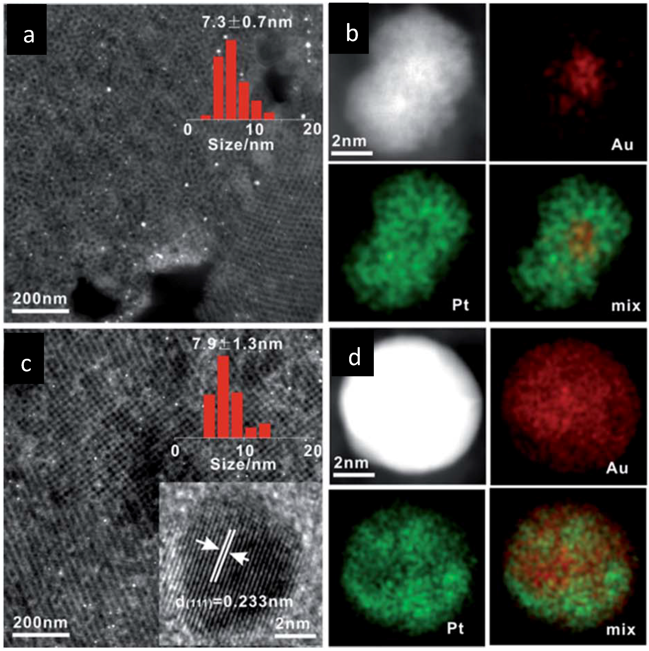 HAADF-STEM images and particle size distribution, typical EDS mappings of Au50Pt50/EP-TiO2 after the photo-deposition (a,b) and after annealing at 350 °C (c,d). Adapted with permission from [48]. Copyright 2014, Royal Society Chemistry.
