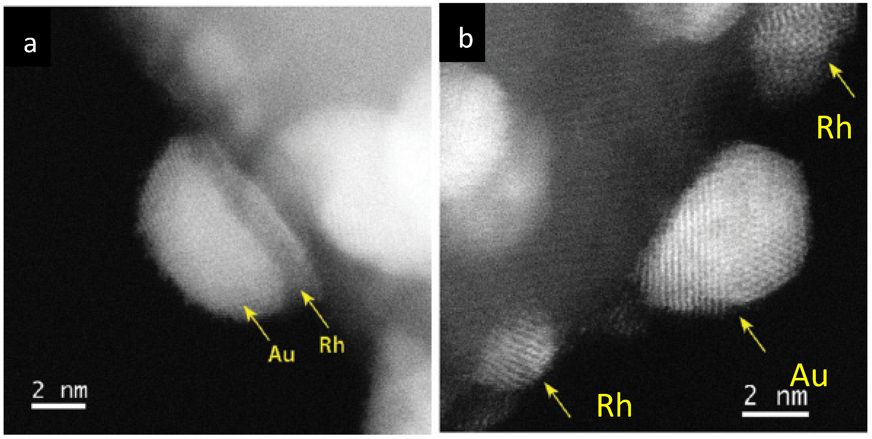 Representative aberration-corrected STEM-HAADF images of particles in Au-Rh/TiO2 sample: (a) a particle after treatment under H2 at 350 °C showing a segregated “Janus-like” configuration with Au/Rh/TiO2 stacking; (b) particles after treatment under O2 then H2 at 350 °C showing metal segregation; smaller ones are Rh and larger ones are Au NPs (more contrasted)—Adapted with permission from [70]. Copyright 2015, Royal Society of Chemistry.