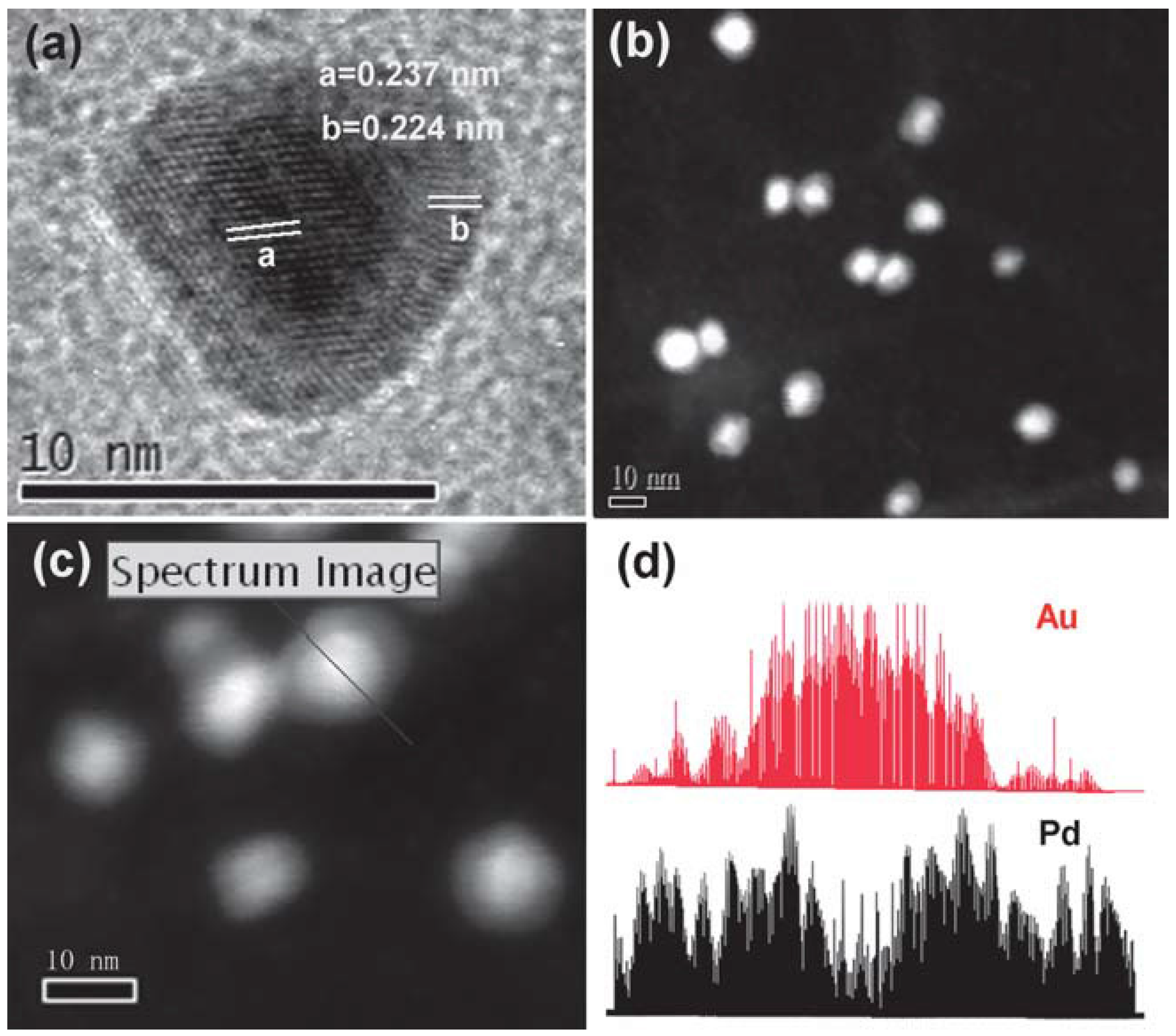 - Regan, M.R.; Banerjee, I.A. Preparation of Au-Pd bimetallic nanoparticles in porous germania nanospheres: A study of their morphology and catalytic activity. Scr. Mater. 2006, 54, 909–914. [Google Scholar] [CrossRef]