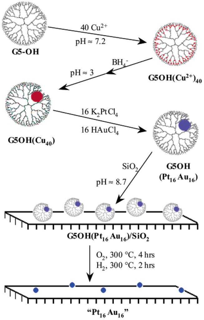 Preparation process of Au-Pt NPs on silica support involving the synthesis of Au-Pt NPs in dendrimers. Copied with permission from [87]. Copyright 2004, American Chemical Society.