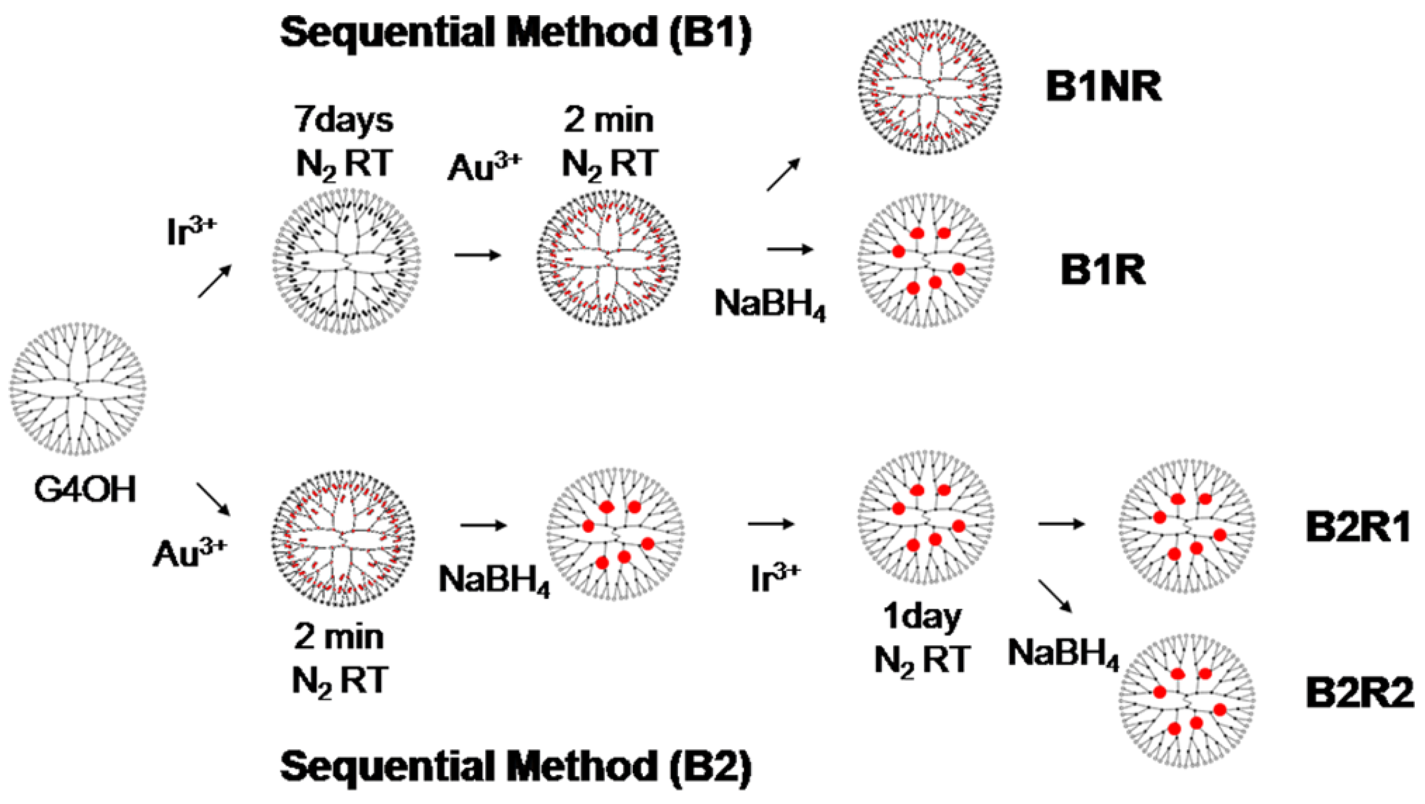 Four sequential method of preparation of bimetallic Au-Ir particles in dendrimers before impregnation on alumina: (B1) IrCl3 then HAuCl4 adsorption (B1NR) and reduction with NaBH4 (B1R); (B2) HAuCl4 adsorption and reduction with NaBH4 then IrCl3 adsorption (B2R1) and reduction with NaBH4 (B2R2). Copied with permission from [90]. Copyright 2013, American Chemical Society.