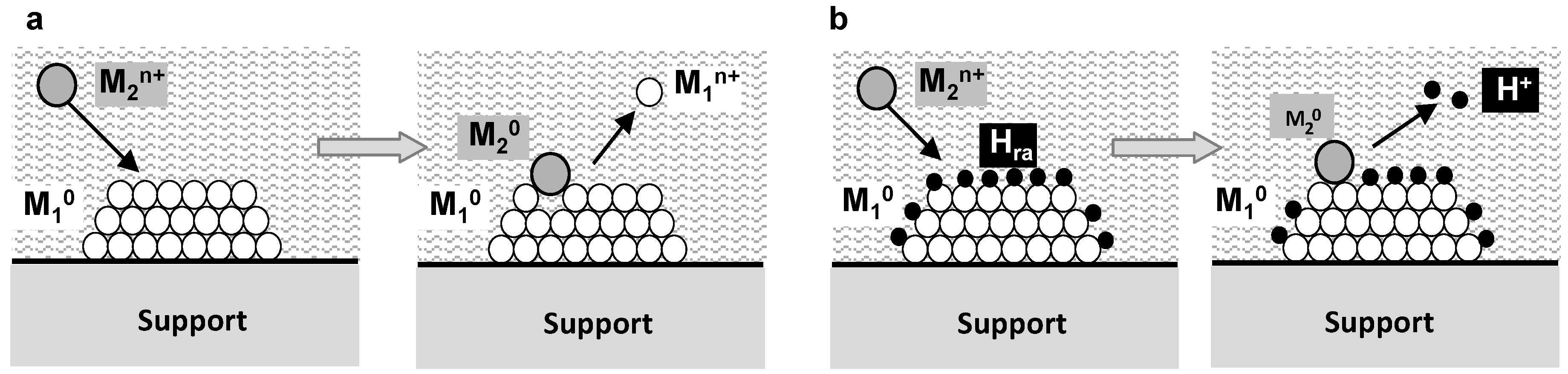 Schematic illustration of the surface redox methods: (a) Direct reduction of M2n+ ions by M10 metal particle, also called galvanic replacement reaction; (b) Reduction of M2n+ ion by active H adsorbed on M10 metal particle resulting from H2 dissociation or activation of a reducing agent on M10.
