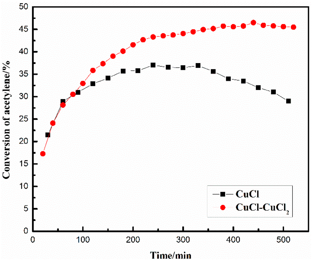 Our previous works found that the addition of CuCl2 to the anhydrous catalyst enhanced acetylene conversion (reaction condition: temperature, 80 °C; space velocity of C2H2, 200 h−1), and the results are shown in Figure 1 [27]. The acetylene conversion can reach above 45% and last 150 min when 10 mol % CuCl2 is added to the catalyst, and the integral molar quantity of Cu+ and Cu2+ was 0.088 mol; by comparison, the acetylene conversion of pure anhydrous Nieuwland catalyst can only reach 36% and declines rapidly. Thus, it is assumed that the addition of an appropriate amount of Cu2+ to Nieuwland catalyst improves acetylene dimerization, although CuCl has always been considered the key active component of the catalyst.