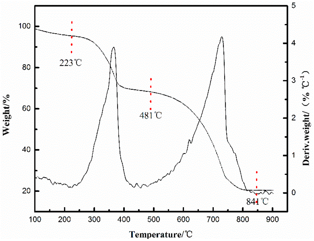 Thermogravimetry-differential thermal analysis (TG/DTG) thermograms for the dark red precipitate.