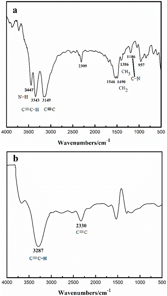 As mentioned above, the formation of precipitates causes a short Nieuwland catalyst lifetime, whether in aqueous solution or in an anhydrous organic solvent. Therefore, we analyzed the composition of the precipitates by using TGA (Thermogravimetric Analysis), FT-IR (Fourier transform infrared spectroscop), and XPS to investigate the reasons why increasing mole ratio of Cu+ leads to precipitate formation. The TGA results show three weight loss temperatures of 223 °C, 481 °C, and 841 °C, corresponding to weight losses of 25%, 50%, and 25%, respectively (Figure 3). The FI-IR spectra of the precipitates obtained at different drying temperatures are shown in Figure 4 (Figure 4a, 100 °C; Figure 4b, 450 °C). Strong, sharp peaks observed at 3343 and 2309 cm−1 could be attributed to C≡C−H and C≡C stretching vibrations, respectively. No peaks were observed within the ranges of 3100–3010 cm−1 and 1610–1690 cm−1, thus confirming the absence of =CH and C=C stretching vibrations in the precipitate. The alkyne present in the precipitate was C2H2. Bands located at 3447 cm−1 indicated N−H stretching vibrations, while bands at 1546 and 957 cm−1 were attributed to N–H bending vibration. Bands located at 1490 and 1380 cm−1 were attributed to CH2 and CH3 bending vibrations, respectively. The FT-IR data obtained when the precipitate was heated at 450 °C in a tube furnace for 1 h with nitrogen is illustrated in Figure 4b. Specific peaks indicating N−H and C−N disappeared, and only the characteristic peaks of C≡C−H and C≡C bonds remained. This result indicates that the first and second weight losses of the precipitate correspond to the losses of CH3CH2NH2 and C2H2, respectively.