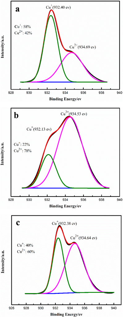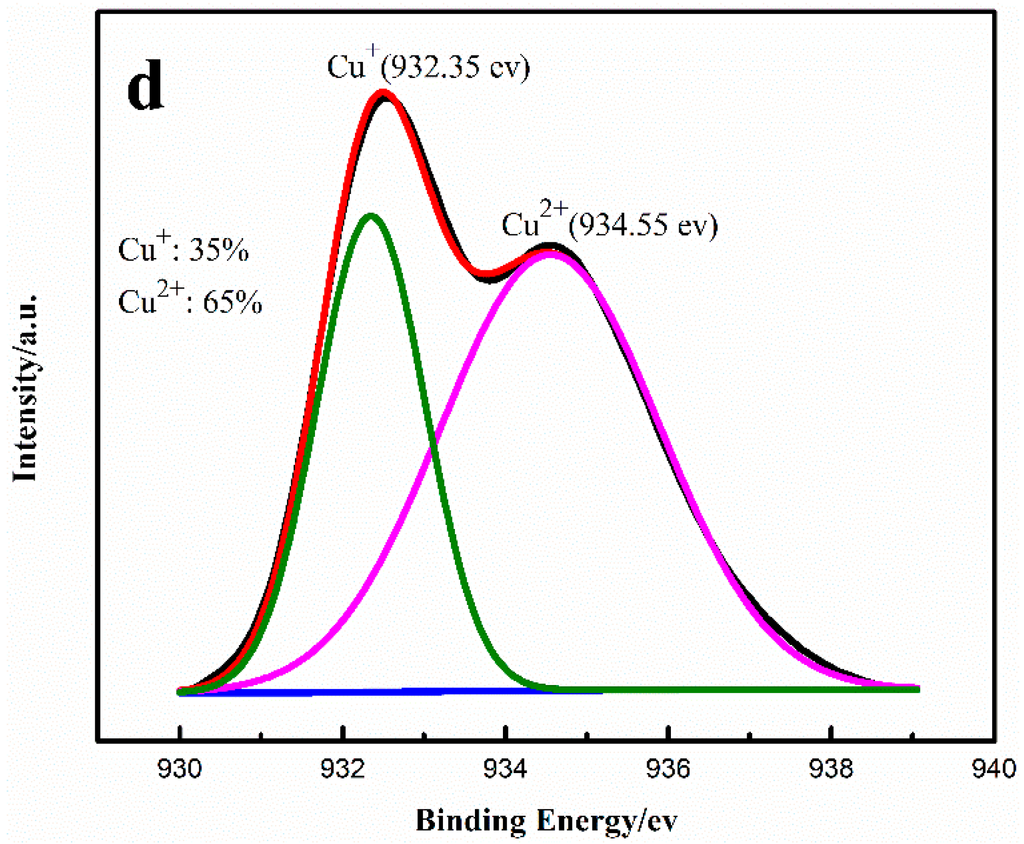 High-resolution XPS spectra of (a) cat-a; (b) cat-b; (c) cat-c; (d) cat-d. Red line: fitting curve; Black line: original data line ; Blue line: original data ; Green line: the characteristic peak of Cu+; Pink line: the characteristic peak of Cu2+.