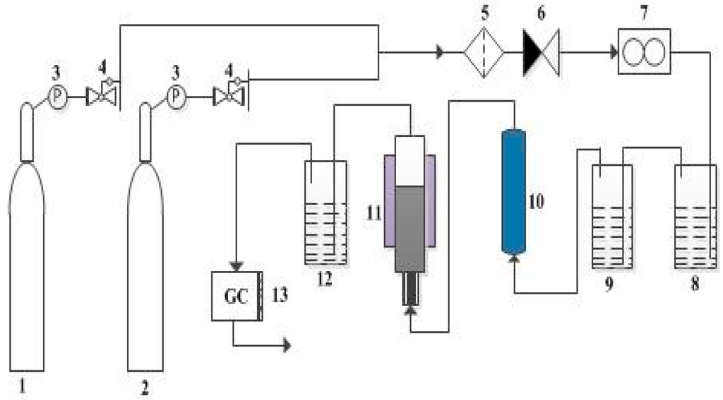 Schematic diagram of the C2H2 dimerization system. (1: C2H2; 2: N2; 3: gas pressure gage; 4: value; 5: gas filter; 6: check valve; 7: mass flow controller; 8: K2Cr2O7 solution; 9 and 12: NaOH solution; 10: drying tube; 11: reactor; 13: Gas Chromatograph (GC-2014C)).