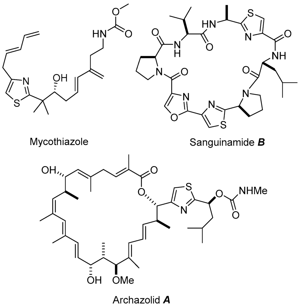 - Dondoni, A.; Marra, A. Thiazole-mediated synthetic methodology. Chem. Rev. 2004, 104, 2557–2599. [Google Scholar] [PubMed]