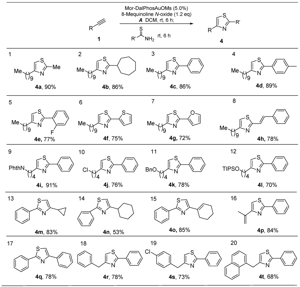 - Wu, G.; Zheng, R.; Nelson, J.; Zhang, L. One-step synthesis of methanesulfonyloxymethyl ketones via gold-catalyzed oxidation of terminal alkynes: A combination of ligand and counter anion enables high efficiency and a one-pot synthesis of 2,4-disubstituted thiazoles. Adv. Synth. Catal. 2014, 356, 1229–1234. [Google Scholar] [CrossRef]