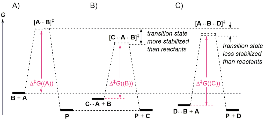 In 1746, Roebuck developed the lead chamber for sulfuric acid production in which nitrogen oxides catalyze the oxidation of SO2 into SO3. Since then, catalysts have been widely employed in a large portion of the chemical industry. The catalysts can be inorganic, organic, or organometallic compounds, as well as enzymes or microorganisms [1,2,3]. Organocatalysis refers to a form of catalysis, in which the rate of a chemical reaction is increased by an organic compound referred to as an organocatalyst consisting of carbon, hydrogen, nitrogen, oxygen, phosphorus, sulfur, and other nonmetal elements. The most common organocatalysts are acids and bases. In the two last decades, organocatalysis has become a pillar of asymmetric organic synthesis [4,5,6,7,8,9,10]. The term catalyst was coined by Berzelius in 1835 [11,12,13], and the term ‘organocatalyst’ was first used by MacMillan in 2000 [6,14]. A catalyst is a compound, generally used in a substoichiometric amounts, that takes part in a reaction, resulting in an increased rate, but is not consumed. It does not affect the equilibrium constant of the reaction. A catalytic reaction is a reaction that is catalyzed. Some reactions are promoted by an additive. In these cases the additive speeds up the reactions and is converted to another species during the reaction. Most reactions can be catalyzed, usually by changing their mechanism, which is in fact always the case if the catalyst interacts with one or more species of the reaction (reactants, intermediates, transition states, products). Catalysts are classified as heterogeneous (most frequent in the industry, bulk chemicals) or homogeneous. A homogeneous catalyst dissolves in the reaction mixture (completely or partially), while a heterogeneous catalyst does not dissolve but acts with the reaction partners through physisorption (−2 to −10 kcal/mol: binding energies, attraction between permanent or induced dipoles or quadrupoles, and attraction due to van der Waals-London forces), or through chemisorption (covalent/electrostatic forces such as hydrogen-bridging and electron transfer). A catalyst of a given reaction is characterized by its turnover number (TON) which is the maximum number of moles of reactants that one mole of catalyst is able to convert into products before it loses its activity. One defines the lifetime of the catalyst for given reaction conditions and the turnover frequency (TOF; [time−1]), which quantifies the specific activity of the catalyst under the conditions used. For most relevant industrial applications, the TOF is in the range between 10−2 and 102 s−1. For enzymes, the TOF generally lie between 103 and 107 s−1. The term turnover rate is also often used and is synonymous with TOF. In general, any elementary process will be either accelerated (decrease of activation free energy Δ‡G) or retarded (increase of Δ‡G) if the reactants and/or the transition structure (activated complex) are associated (make complexes) with one or more than one (cluster) spectator molecules (solvent, additive, catalyst, inhibitor and combination of them). This is represented in Figure 1 for a bimolecular reaction involving reactants A and B occurring (A) in the gas phase, without any other molecule, (B) in the presence of an additive C that stabilizes the transition structure better than the reactants (Δ‡G((B)) < Δ‡G(A))) and (C) in the presence of an additive D that stabilizes the reactants better than the transition structure (Δ‡G(C)) > Δ‡G((A)). This representation does not involve dynamic effects, i.e., the possibility to have a collection of possible transition structures in the transition state. A catalytic effect results from the combination of an enthalpy effect and an entropy effect.
