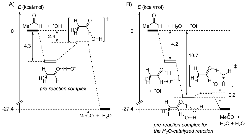 Water introduces many unusual features into the energetics of chemical and biological reactions [15,16]. Beyond the properties of bulk water, a single molecule of H2O, or an aggregate may influence the rate of a reaction [17,18]. For instance, water forms complexes with radicals and polar molecules in thermal reactions [19,20] and such complexation alters the reaction activation free energies. Kinetic studies as well as quantum chemical mechanical calculations have shown that one molecule of water accelerates hydrogen abstraction from acetaldehyde by hydroxyl radical, to produce acetyl radical and a water molecule, as represented in Figure 2 [21].
