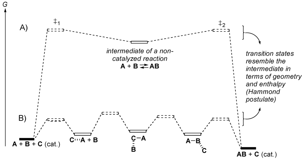 A homogeneous catalyst is a molecule that adds intermediates and transition structures on the pathway from reactants to products (Figure 3). A good catalyst first makes a complex with one reactant and then weakens the bonds that must be broken. If the process is bimolecular, the first complex must be able to bind with little activation free energy to the second reactant (template effect) and bring both reactants into a stabilized activated complex (transition state). A good catalyst is a compound that does not bind too strongly to the reactants, does not form intermediates that are more stable than the products, that lowers the activation free energies of all the elementary processes converting the reactants into the initial complex first, and then converts this complex into the next intermediate, and so on. A good catalyst should not bind to the product. Otherwise the product becomes an inhibitor of the catalyzed reaction.