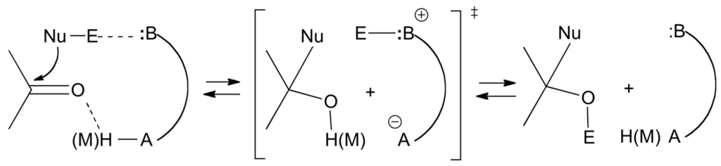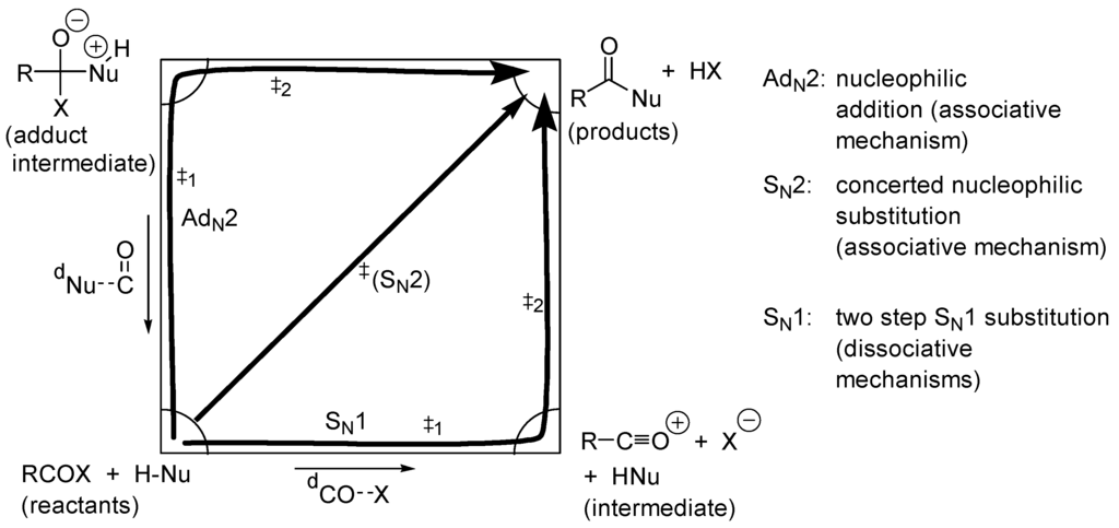 In the absence of any catalyst and in a solvent that cannot play either the role of an acid, nor that of a base (e.g., PhMe), the reactions in Scheme 1 can follow three limiting mechanisms represented in the Jencks-More O’Ferrall type of diagram of Figure 4.