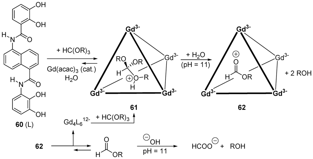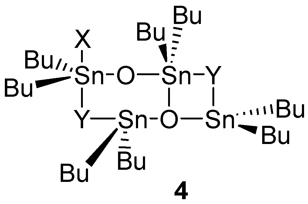 The zinc cluster Zn4(OCOCF3)O is an amphoteric compound (the metallic centers are Lewis acids and the oxygen centers are Lewis bases). This is also the case with distannoxane catalysts of type 4 (Figure 6) [38,39,40,41]. Other oxometallic species catalyze nucleophilic acyl substitution reactions with protic nucleophiles. Examples are TiO(acetylacetonate)2, vanadyl dichloride VOCl2(THF)n, [48] and Y5(O-i-Pr)13O [76], all being water-tolerant catalysts.
