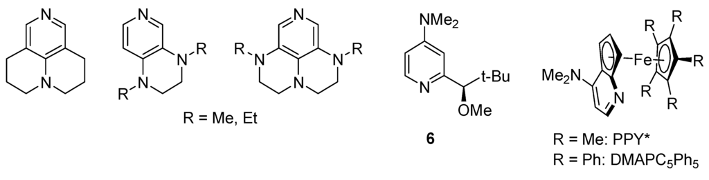 Electron-rich pyridines listed below are proposed to be better than DMAP as nucleophilic catalysts (Figure 7) [84,85,86]. In 1996, Vedejs and Chen introduced 6 as the first member of the chiral DMAP family that was used in stoichiometric amounts with two equivalents of a Lewis acid to carry out the resolution of 1-arylethanols [87]. Enantiomerically pure DMAP derivatives such as PPY* and DMAPC5Ph5 (Fu's catalysts also introduced in 1996) [88,89] are commercially available and can be used as chiral catalysts in kinetic resolution of alcohols, amines and to induce asymmetric cycloadditions, protonations, C-acylations, halogenations and Michael additions [90]. A large number of other enantiomerically pure p-dialkylaminopyridines have been proposed for enantioselective acyl transfers [91].