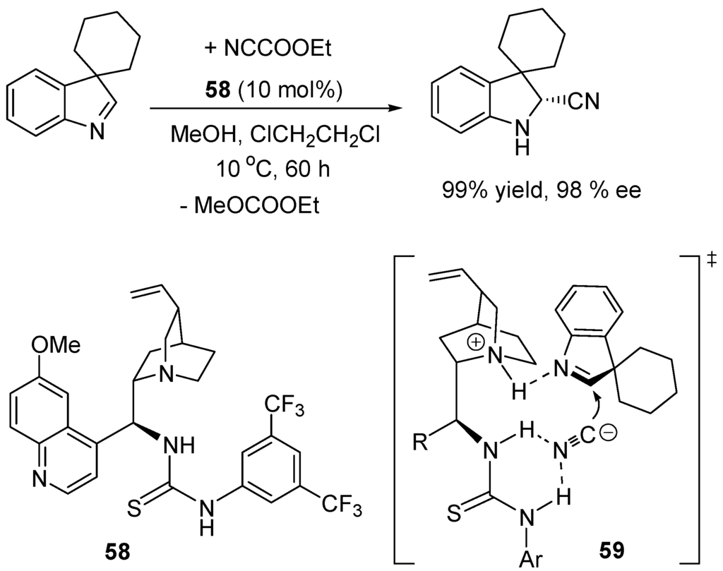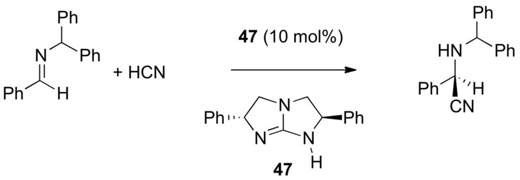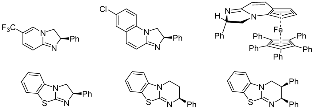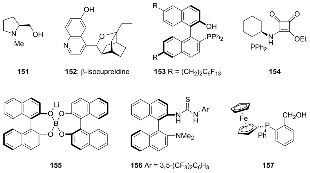 Amidines (e.g., 1,8-diazabicyclo[5.4.0]undec-7-ene: DBU, 1,5-diazabicyclo[4.3.0]non-5-ene: DBN) [106,107], isothioureas (e.g., 2,3,6.7-tetrahydro-5H-thiazolo[3,2-a]pyrimidine: THTP, 3,4-dihydro-2H-pyrimido[2,1-b]benzothiazole: DHPH) and guadinines (e.g., 1,5,7-trazabicyclo[4.4.0]dec-5-ene: TBD) can also form acylium salts with carboxylic anhydrides which make them to catalyze acyl transfers through nucleophilic substitution, analogous with electron-rich pyridines (nucleophilic catalysts), not just as bases. Several enantiomerically pure amidine, isothiourea and guadinine derivatives have been prepared and tested for their ability to catalyze enantioselective acyl transfers as shown first by Birman and co-workers in 2004 [108]. Examples are given in Figure 8 [109,110].