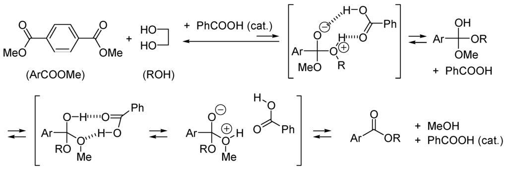 With this hypothetical reaction, one sees that the two-step nucleophilic addition route implies the formation of a zwitterion from uncharged reactants. It is obvious that such a process will be facilitated by polar solvent and by any additive that can take a proton from it (base-catalyzed addition: BAC2) or protonate the alkoxide moiety (acid-catalyzed addition: AAC2). Any compound able to give a proton and take a proton from the zwitterionic, tetrahedral intermediate will catalyze the addition reaction. This is the case with carboxylic acids such as benzoic acid (Scheme 3), which catalyzes the formation of poly(ethylene)terephthalate by transesterification of methyl terephthalate with ethylene glycol [58].