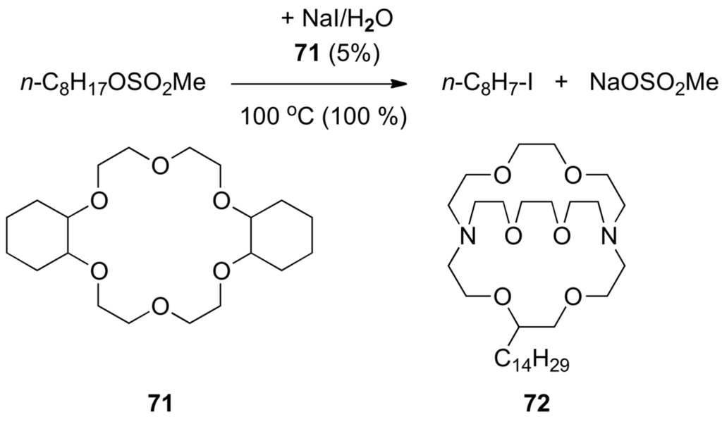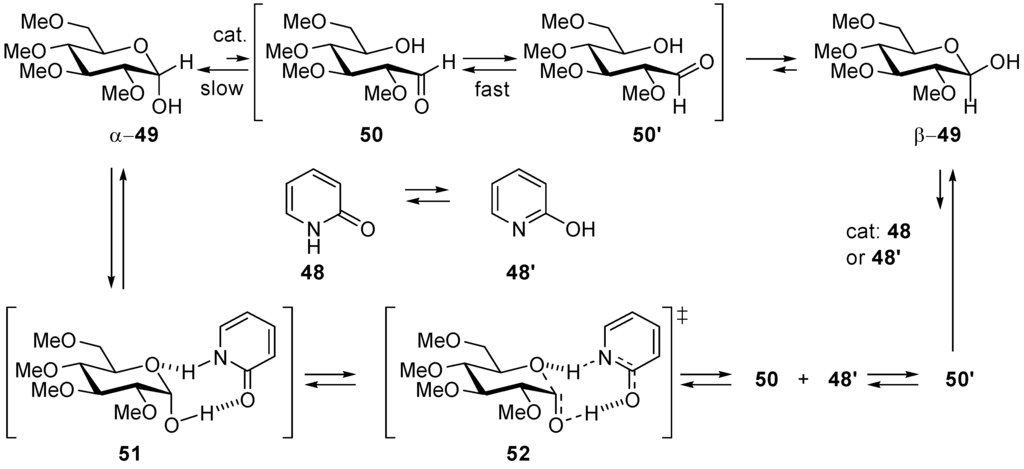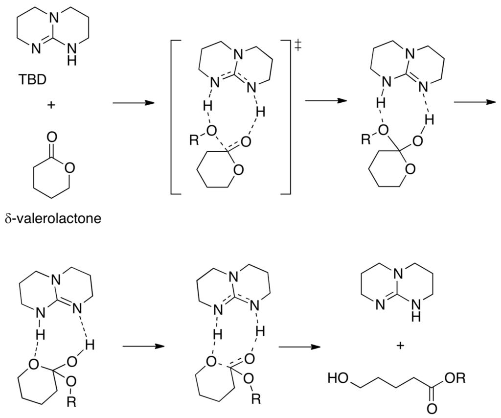 In an analogous way to benzoic acid that is a bifunctional catalyst (OH: acid; C=O: base), triazabicyclo[4.4.0]dec-5-ene (TBD) is an efficient catalyst of the ring-opening polymerization of cyclic esters (lactones) [59]. The mechanism of the ring-opening reaction of l-lactide [60] and δ-valerolactone [61] (Scheme 4) has been studied computationally. TBD donates a hydrogen bond to the carbonyl group of the lactone, activating it towards nucleophilic attack by the alcohol, which is also activated by TBD through accepting a hydrogen bond to its imine-like nitrogen. TBD then effects the ring opening by hydrogen-bonding to what is formerly the carbonyl oxygen in the tetrahedral intermediate, but transferring the hydrogen (originally from the alcohol) to the ring oxygen adjacent to the former carbonyl group.