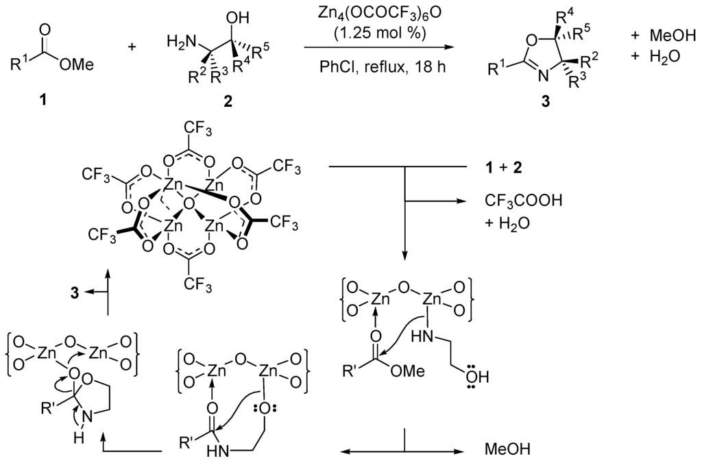 The tetranuclear zinc cluster Zn4(OCOCF3)6O catalyzes the direct conversion of esters, lactones, and carboxylic acids to oxazolines with remarkable chemoselectivity. The possible mechanism for these reactions is outlined in Scheme 5 for methyl esters 1 reacting with amino alcohols 2 giving oxazolines 3.