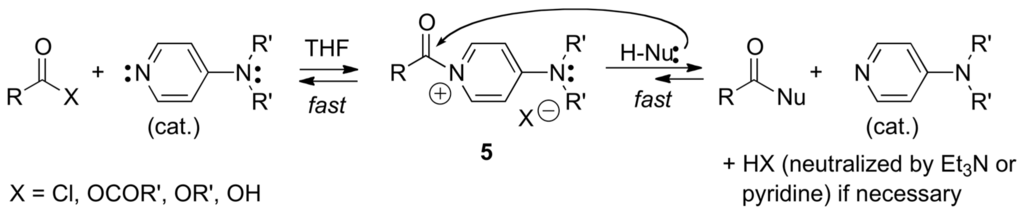 DMAP and other 4-aminopyridines have been used to catalyze acyl or sulfonyl transfer reactions, including the reactions of (t-BuO)2CO (Boc2O) with amines, alcohols, diols, aminoalcohols, and aminothiols [82] and the chemoselective trifluoroacetylation of anilines using ethyl trifluoroacetate [83]. The catalytical effect of DMAP and analogous 4-aminopyridines results from their high nucleophilicity, favoring a fast addition/elimination process that generates the N-acylpyridinium intermediates 5. In turn, 5 adds rapidly to protic nucleophiles to generate the corresponding products of acyl transfer (Scheme 7).