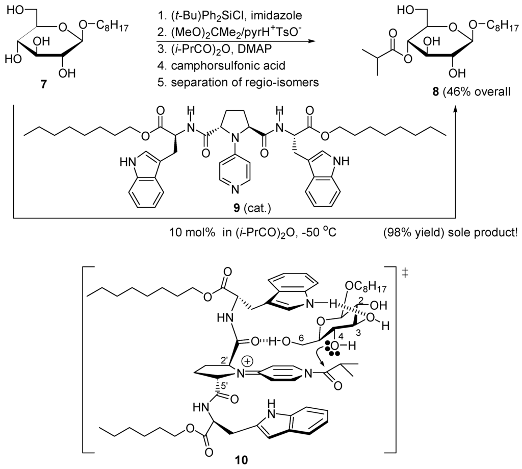When the nucleophilic catalyst is part of a compound able to recognize a polyfunctional substrate, regioselective acyl transfer can be realized. As shown in Scheme 8, the classical conversion of n-octyl β-D-glucopyranoside (7) into its 4-O-isobutyryl derivative 8 requires five synthetic steps and a final separation of regioisomeric esters. But with 10 mol % catalyst 9, this conversion is accomplished in isobutyryl anhydride at −50 °C giving a sole product in 98% yield. Transition structure 10 has been proposed for this highly regioselective monoacylation [92].