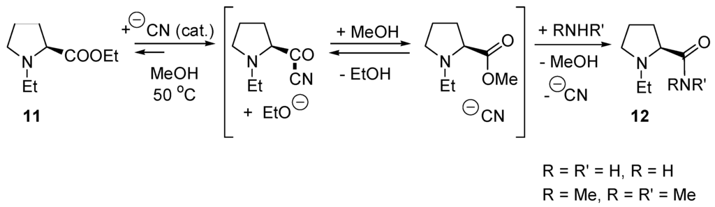 Transesterification of phosphonoacetates catalyzed by DMPA exchanges only the carboxylic esters. Similarly, reactions of phosphonoacetates with primary and secondary amines in the presence of DMAP produce the corresponding phosphonoacetamides in good yields [93]. Instead of DMAP, the cyanide anion can catalyze acyl transfer reactions (Scheme 9). In a study comparing the catalytic activities of DMAP, 2-hydroxypyridine, imidazole, and NaCN in the difficult aminolyses of ethyl (S)-1-ethyl-2-pyrrolidinecarboxylate (11) in MeOH, NaCN proved to be a superior catalyst which does not induce racemization of products 12 [94].