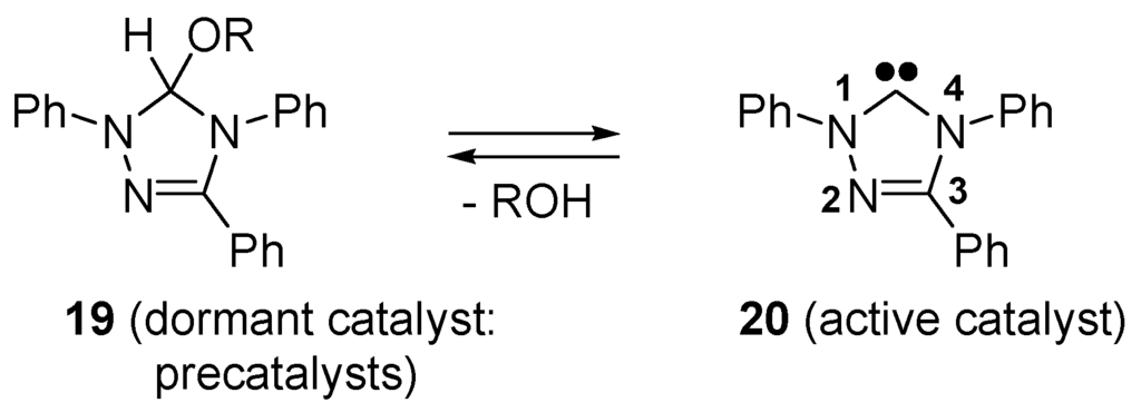 N-Heterocyclic carbenes act as catalysts for living ring-opening polymerizations of lactones, generating polyesters [115,116] (see e.g., Scheme 4). The pre-catalyst can be an alcohol adduct of the N-heterocyclic carbene, e.g., 19, which, upon heating, generates 1,3,4-triphenyl-1,4-dihydro-1H-1,2,4-triazol-5-ylidene (20) (Scheme 12). Since these early applications, N-heterocyclic carbenes have been used as organocatalysts for a large variety of reactions [117,118].