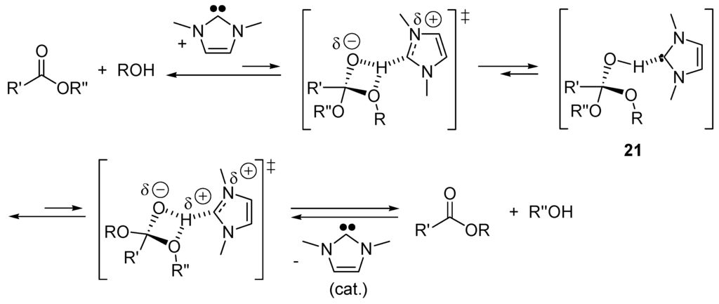 Applying the B3LYP density functional approach, Hu and co-workers [119] proposed the mechanism in Scheme 13 for the NHC-catalyzed transesterification. The role of NHC is to assist proton transfer from alcohol to the carbonyl group of the ester, forming the tetrahedral intermediate 21, which then decomposes to form the acylated product.