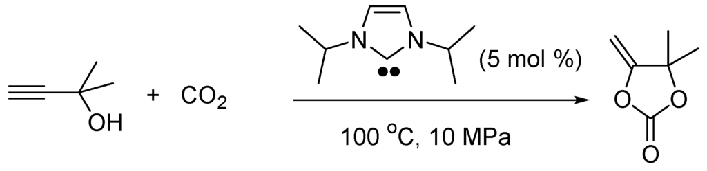 Singh and Nolan also found that the nucleophilic NHCs can catalyze the transesterification of phosphorous esters under mild conditions using imidazolium salts as pre-catalysts [120]. N-Heterocyclic carbenes catalyze the CO2 fixation as a vinyl carbonate. For instance, the carboxylative cyclization of 2-methylprop-3-yn-2-ol with 5 mol % 1,3-diisopropyl-4,5-dimethylimidazol-2-ylidene (100 °C, 10 MPa, 15 h) gives 5-methylidene-4,4-dimethyl-1,3-dioxolan-2-one in 80% yield (Scheme 14) [121].