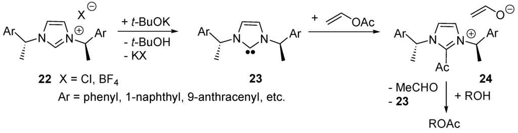 In 2004, Suzuki and co-workers reported the first examples of NHCs of type 23 (Scheme 15) as catalysts for enantioselective acyl transfers [122]. They applied them to the kinetic resolution of racemic secondary aryl alkyl alcohols [123]. Further examples were reported by Maruoka’s group [124]. In this case one postulated the formation of 2-acylimidazolium ion intermediates of type 24 (Scheme 15), the NHC acting as a nuleophilic catalyst. The formation of 2-acylimidazolium ion intermediates has been postulated also in the NHC-catalyzed (4+2)-cycloaddition/decarboxylation of silyl dienol ethers with α,β-unsaturated acyl fluorides [125,126] and for several other NHC-catalyzed reactions involving carboxylic moieties [127,128,129].