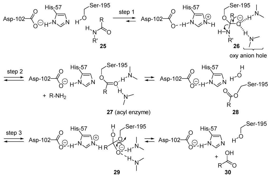 One important biological acyl transfer reaction is the hydrolysis of the amide linkage in a protein (e.g., 25). Chymotrypsin is one of the most well studied peptidases (enzymes that catalyze the cleavage of peptide bonds) [130,131,132]. Instead of using water as nucleophile, the alcohol side chain of serine-195 is used (Scheme 16). The addition of this alcohol moiety is base-catalyzed by the side chain of histidine-57, an imidazole (step 1). Ion-pairing of the resulting imidazolium ion with the aspartate-102 enhances the basicity of histidine-57. The combination of the serine, histidine and aspartate residues constitutes the catalytic triad. This generates a tetrahedral intermediate 26 (as for mechanism BAC2, Table 1) that is stabilized by hydrogen bonding in a pocket called the oxy-anion hole. Amide NH bond from the enzyme backbone contributes to the hydrogen bonding donors. After reorientation of the tetrahedral intermediate 26, the leaving group departure is acid-catalyzed by the imidazolium ion created in step 1. This forms an acyl-enzyme intermediate 27 (end of step 2) and one of the products, the amine R'NH2. Then water enters the active site and attacks (step 3) the carbonyl group of 28, a base-catalyzed addition promoted, as for the serine-OH addition in step 1, by the imidazole unit of histidine-57. This produces tetrahedral intermediate 29, which then liberates serine-198 and the carboxylic acids RCOOH (30), the second product.