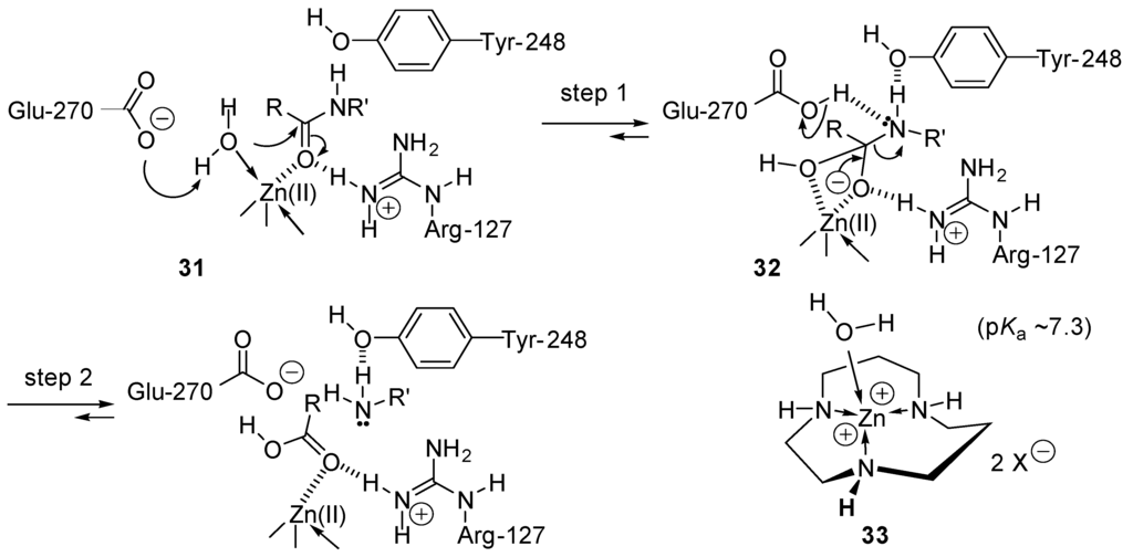 Another amide bond cleavage mechanism is followed by the carboxypeptidase A-catalyzed hydrolysis [133,134]. In this case, activation of the nucleophilic addition of water implies coordination of water (the nucleophile) and the carbonyl group (the electrophile) of the amide 21 to a zinc cation (Lewis acid, template effect). Furthermore, the nucleophilicity of water is enhanced by hydrogen bridging with glutamate-270 and by coordination to Zn(II). Its pKa is expected to be decreased significantly because it coordinates Zn(II), as shown for complex 33 [135,136]. Further electrophilic activation of the carbamide is realized by hydrogen bridging of its amino group with the phenolic moiety of tyrosine-248 and of its carbonyl group with arginium cation Arg-127 (step 1, Scheme 17). This leads to the formation of the tetrahedral intermediate 32. In a second step, tyrosine- and glutamic acid-catalyzed elimination of the amine R'NH2 occurs, followed by the liberation of the carboxylic acid, RCOOH.