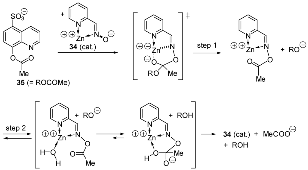 In 1965, Breslow and Chipman [137] reported that zinc pyridinecarboxaldoxime anion complex 34 is an effective catalyst in the hydrolysis of 8-acetoxyquinoline-5-sulfonate (35), a weakly complexing substrate. The reaction occurs in two steps involving acyl transfer within a catalyst-substrate complex (Scheme 18).