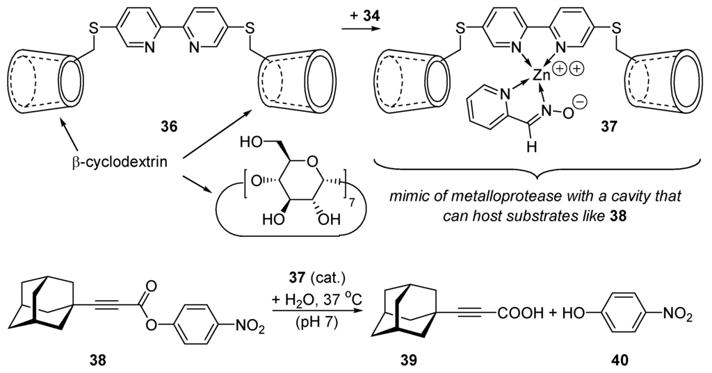 When 34 is coordinated with the β-cyclodextrin derivative 36 containing a linking bipyridyl group, the complex 37 so-obtained catalyzes the hydrolysis of ester 38 with a rate enhancement of 1,700,000-fold over the background reaction (pH 7, 37 °C) [138,139]. The two β-cyclodextrin units offer a cavity to the substrate as an enzyme [140]. The adamantyl moiety of 38 enters the lyophilic cavity of one cyclodextrin, the leaving group (p-nitrophenolate) enters the other cyclodextrin unit, repelling water molecules [141]. The substrate is thus forced to approach the zinc pyridinecarboxaldoxime anion that adds (Scheme 19) onto its carboxylic moiety, generating an acyl-catalyst intermediate that is then hydrolyzed into p-nitrophenol (40) and the carboxylic product (39). Several applications of cyclodextrins as catalysts have been reported [142].