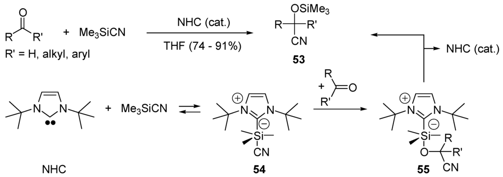 - Enders, D.; Balensiefer, T. Nucleophilic carbenes in asymmetric organocatalysis. Acc. Chem. Res. 2004, 37, 534–541. [Google Scholar] [CrossRef] [PubMed]