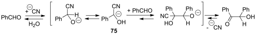 Acyl transfer reaction catalyzed by cyanide.