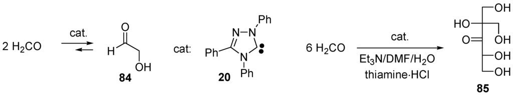 - Teles, J.H.; Melder, J.P.; Ebel, K.; Schneider, R.; Gehrer, E.; Harder, W.; Brode, S.; Enders, D.; Breuer, K.; Raabe, G. The chemistry of stable carbenes 2. Benzoin-type condensations of formaldehyde catalyzed by stable carbenes. Helv. Chim. Acta 1996, 79, 61–83. [Google Scholar] [CrossRef]