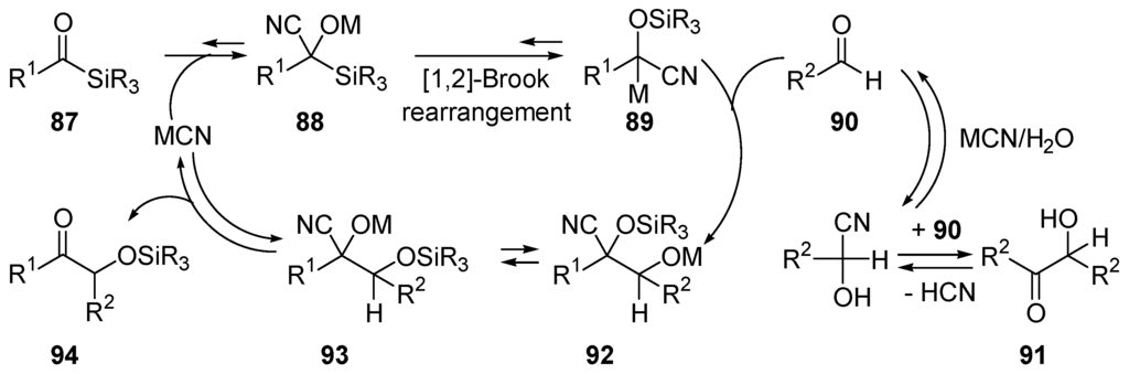 - Xin, L.H.; Bausch, C.C.; Johnson, J.S. Mechanism and scope of the cyanide-catalyzed cross silyl benzoin reaction. J. Am. Chem. Soc. 2005, 127, 1833–1840. [Google Scholar]
