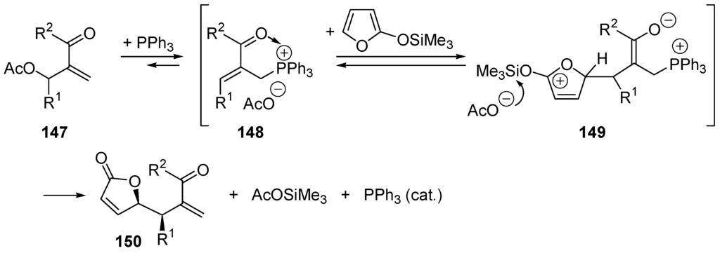 - Cho, C.W.; Krische, M.J. Regio- and stereoselective construction of ɣ-butenolides through phosphine-catalyzed substitution of Morita–Baylis–Hillman acetates: An organocatalytic allylic alkylation. Angew. Chem. Int. Ed. 2004, 43, 6689–6691. [Google Scholar] [CrossRef] [PubMed]