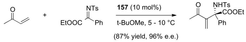 - Shi, M.; Chen, L.H.; Teng, W.D. Asymmetric aza-Morita–Baylis–Hillman reaction of N-sulfonated imines with methyl vinyl ketone catalyzed by chiral phosphine Lewis bases bearing perfluoroalkanes as pony tails. Adv. Synth. Catal. 2005, 347, 1781–1789. [Google Scholar] [CrossRef]