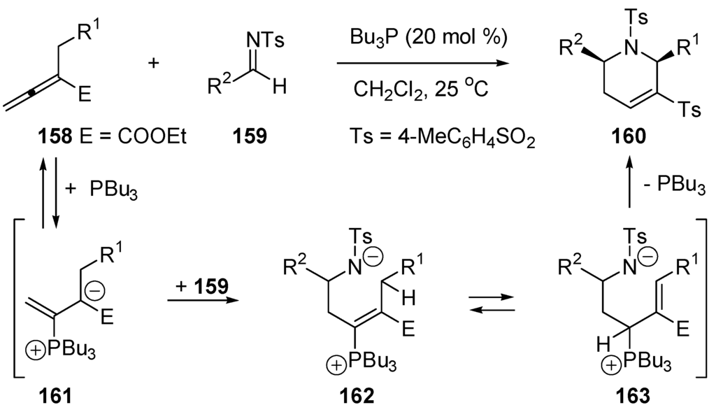 - Zhu, X.F.; Lan, J.; Kwon, O. An expedient phosphine-catalyzed [4+2] annulation: Synthesis of highly functionalized tetrahydropyridines. J. Am. Chem. Soc. 2003, 125, 4716–4717. [Google Scholar] [CrossRef] [PubMed]