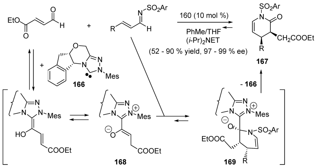 - He, M.; Struble, J.R.; Bode, J.W. Highly enantioselective azadiene Diels–Alder reactions catalyzed by chiral N-heterocyclic carbenes. J. Am. Chem. Soc. 2006, 128, 8418–8420. [Google Scholar] [CrossRef] [PubMed]