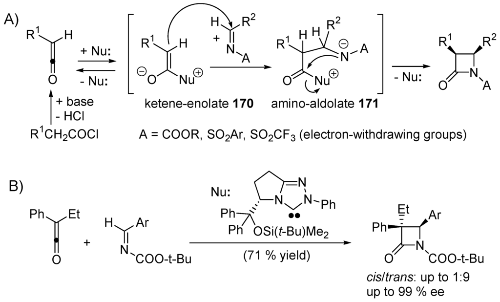 - Zhang, Y.R.; He, L.; Wu, X.; Shao, P.L.; Ye, S. Chiral N-heterocyclic carbene catalyzed Staudinger reaction of ketenes with imines: Highly enantioselective synthesis of N-Boc β-lactams. Org. Lett. 2008, 10, 277–280. [Google Scholar] [CrossRef] [PubMed]