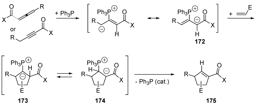 - Zhang, C.M.; Lu, X.Y. Phosphine-Catalyzed Cycloaddition of 2,3-Butadienoates Or 2-Butynoates with Electron-Deficient Olefins—A Novel [3+2]-Annulation Approach to Cyclopentenes. J. Org. Chem. 1995, 60, 2906–2908. [Google Scholar] [CrossRef]