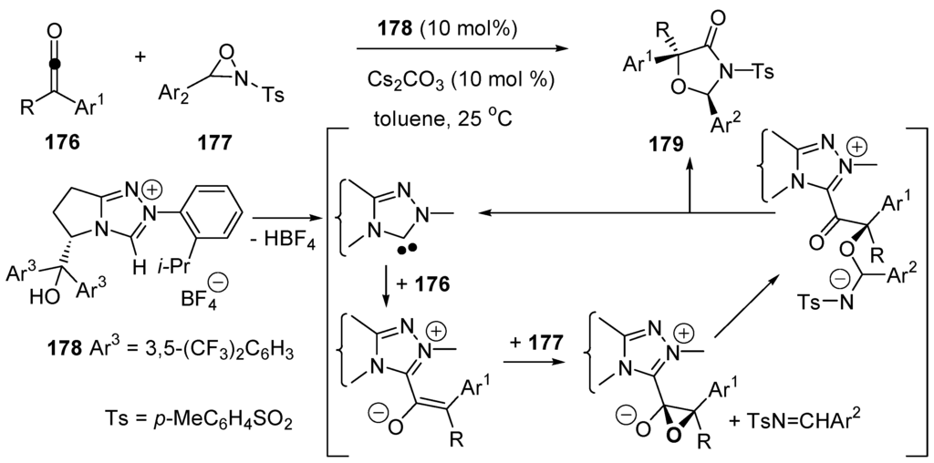 - Shao, P.L.; Chen, X.Y.; Ye, S. Formal [3+2] Cycloaddition of Ketenes and Oxaziridines Catalyzed by Chiral Lewis Bases: Enantioselective Synthesis of Oxazolin-4-ones. Angew. Chem. Int. Ed. 2010, 49, 8412–8416. [Google Scholar] [CrossRef] [PubMed]