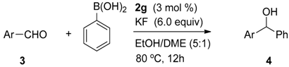 - Sakai, M.; Ueda, M.; Miyaura, N. Rhodium-catalyzed addition of organoboronic acids to aldehydes. Angew. Chem. Int. Ed. 1998, 37, 3279–3281. [Google Scholar] [CrossRef]
