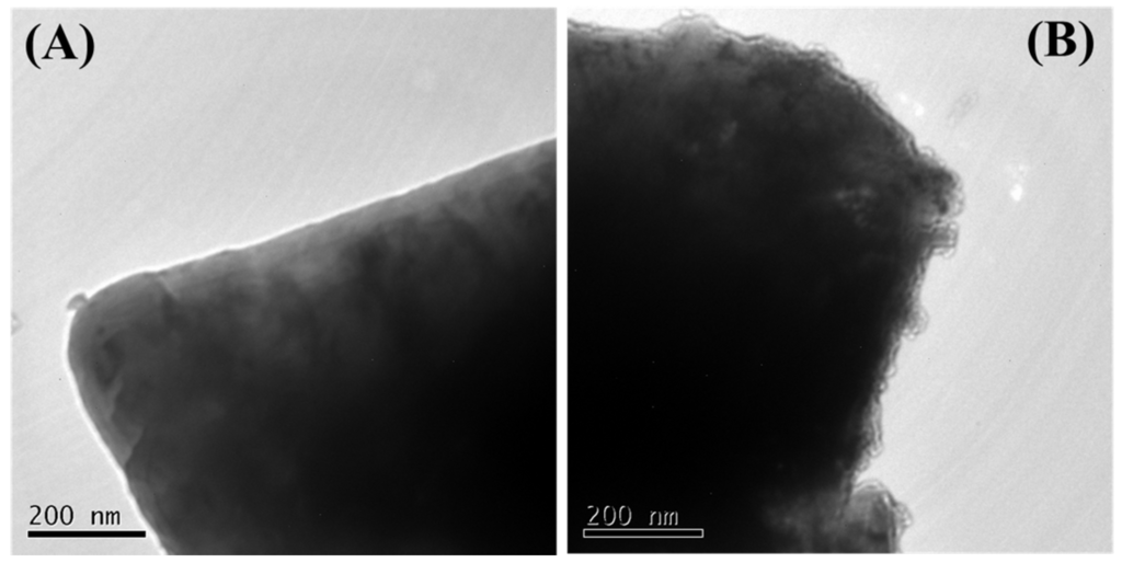 TEM (transmission electron microscopy) images of (A) TiSi2 and (B) WS2-1/TiSi2-723.